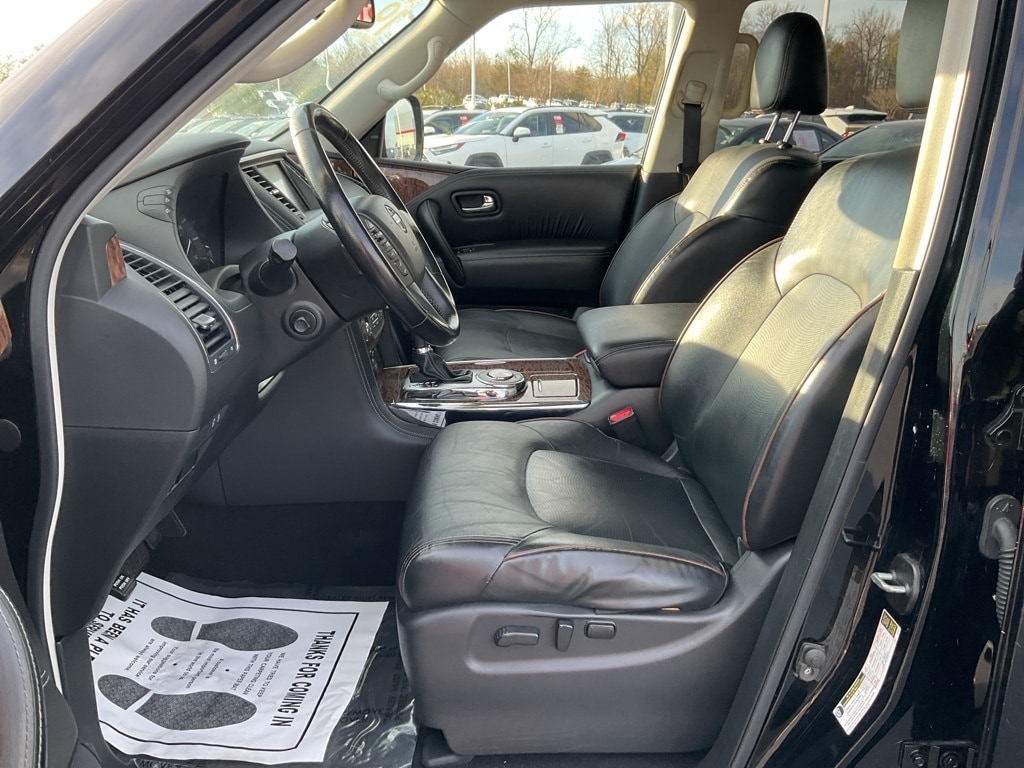 Check out all these great options Premium Package (Blind Spot Warning, Intelligent Back-Up Intervention (I-BI), Intelligent Distance Control (I-DC), Power Sliding Moonroof w/Front Tilt & Rear Slide, and Rear Cross Traffic Alert (RCTA)), 13 Speakers, 2.937 Axle Ratio, 2nd & 3rd Row Carpeted Mats, 3rd row seats: split-bench, 4-Wheel Disc Brakes, ABS brakes, Air Conditioning, Alloy wheels, AM/FM radio: SiriusXM, Anti-whiplash front head restraints, Auto tilt-away steering wheel, Auto-dimming door mirrors, Auto-dimming Rear-View mirror, Auto-leveling suspension, Automatic temperature control, Brake assist, Bumpers: body-color, CD player, Delay-off headlights, Driver door bin, Driver vanity mirror, Dual front impact airbags, Dual front side impact airbags, Electronic Stability Control, Emergency communication system: NissanConnect Services, Four wheel independent suspension, Front anti-roll bar, Front Bucket Seats, Front Center Armrest, Front dual zone A/C, Front fog lights, Front reading lights, Fully automatic headlights, Garage door transmitter: HomeLink, Heated door mirrors, Heated Front Bucket Seats w/Driver Memory, Heated front seats, Illuminated entry, Leather Shift Knob, Leather-Appointed Seat Trim, Low tire pressure warning, Memory seat, Navigation System, Occupant sensing airbag, Outside temperature display, Overhead airbag, Overhead console, Panic alarm, Passenger door bin, Passenger vanity mirror, Power door mirrors, Power driver seat, Power Liftgate, Power passenger seat, Power steering, Power windows, Radio data system, Radio: AM/FM/SXM/CD/MP3/HD, Rain sensing wipers, Rear air conditioning, Rear anti-roll bar, Re