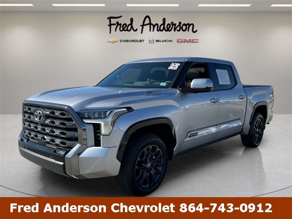 Check out all these great 12 Speakers, 3.31 Axle Ratio, 4-Wheel Disc Brakes, ABS brakes, Air Conditioning, Alloy wheels, AM/FM radio: SiriusXM, Apple CarPlay/Android Auto, Auto High-beam Headlights, Auto-dimming door mirrors, Auto-dimming Rear-View mirror, Automatic temperature control, Brake assist, Bumpers: body-color, Delay-off headlights, Driver door bin, Driver vanity mirror, Dual front impact airbags, Dual front side impact airbags, Electronic Stability Control, Emergency communication system: Safety Connect (10-year trial), Exterior Parking Camera Rear, Front anti-roll bar, Front Bucket Seats, Front Center Armrest, Front dual zone A/C, Front fog lights, Front reading lights, Front wheel independent suspension, Fully automatic headlights, Garage door transmitter: HomeLink, Heated & Ventilated Front Bucket Seats, Heated door mirrors, Heated front seats, Heated rear seats, Heated steering wheel, Illuminated entry, Knee airbag, Leather Shift Knob, Leather steering wheel, Low tire pressure warning, Memory seat, Navigation System, Occupant sensing airbag, Outside temperature display, Overhead airbag, Overhead console, Panic alarm, Passenger door bin, Passenger vanity mirror, Power door mirrors, Power driver seat, Power moonroof, Power passenger seat, Power steering, Power windows, Premium Leather Seat Trim, Radio data system, Radio: Premium Audio w/JBL, Rain sensing wipers, Rear reading lights, Rear seat center armrest, Rear step bumper, Rear window defroster, Remote keyless entry, Security system, Speed control, Speed-sensing steering, Split folding rear seat, Steering wheel memory, Steering wheel mounted audio controls, Tachometer, Telescoping steering wheel, Tilt steering wheel, Traction control, Trip computer, Turn signal indicator mirrors, Variably intermittent wipers, Ventilated front seats, Ventilated rear seats, Voltmeter, and Wheels: 20" x 8" Dark-Painted Alloy. Celestial Silver Metallic 2025 Toyota Tundra Hybrid Platinum CARFAX One-Owner. **STEERING WHEEL AUDIO CONTROLS**, **ONE-OWNER**, **NO ACCIDENT HISTORY ON CARFAX**, **LOCAL TRADE**, **KEYLESS ENTRY**, **GREAT CARFAX SERVICE HISTORY**, **BEDLINER**, **AUTOMATIC TRANSMISSION**, **4WD**, **BACK UP CAMERA**, **BLUETOOTH**, **SUNROOF/MOONROOF, **POWER SEAT**, **NAVIGATION**, **Heated Seats**.